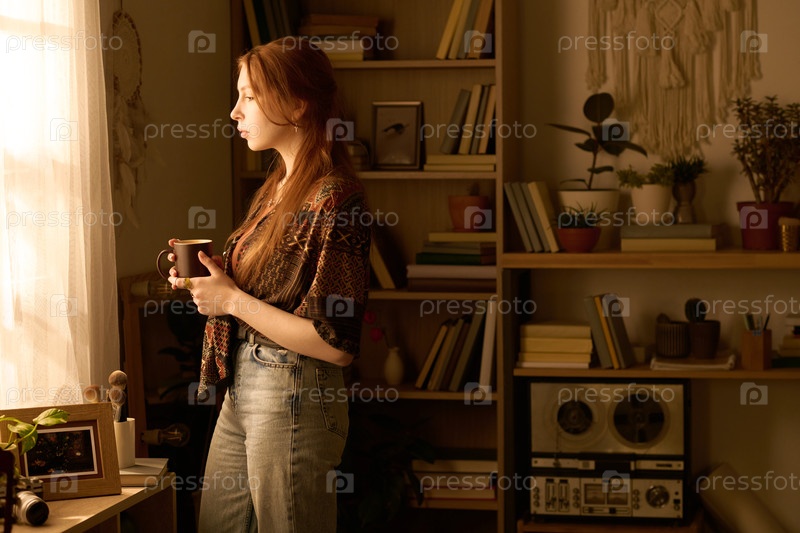 Молодая женщина стоит у окна, держит кружку и смотрит наружу
