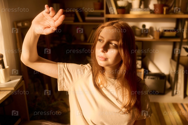 Молодая женщина защищает глаза от солнечного света в помещении днем