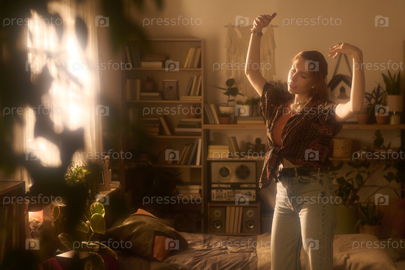 Молодая женщина танцует одна в солнечной спальне, наслаждаясь музыкой