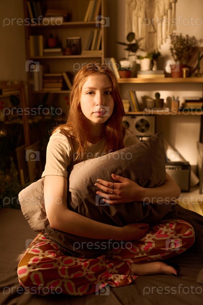 Портрет молодой взрослой женщины, обнимающей подушку в тепло освещенной комнате