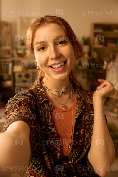 Портрет молодой взрослой женщины, улыбающейся и делающей селфи в помещении
