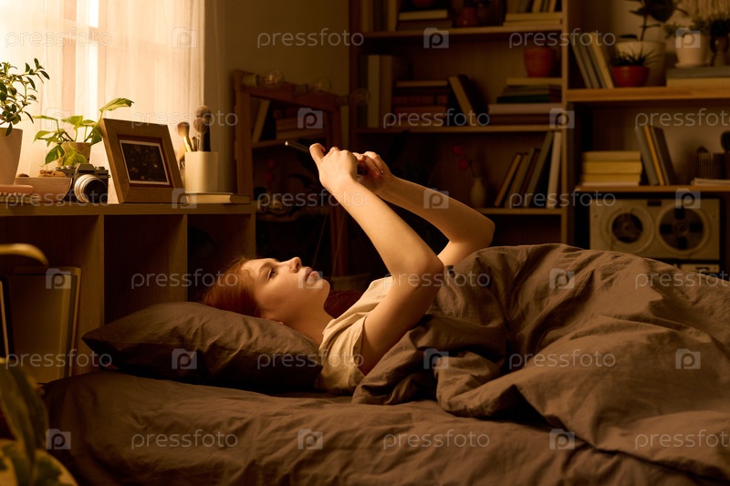 Девушка-подросток, лежащая в постели с помощью смартфона в уютной спальне