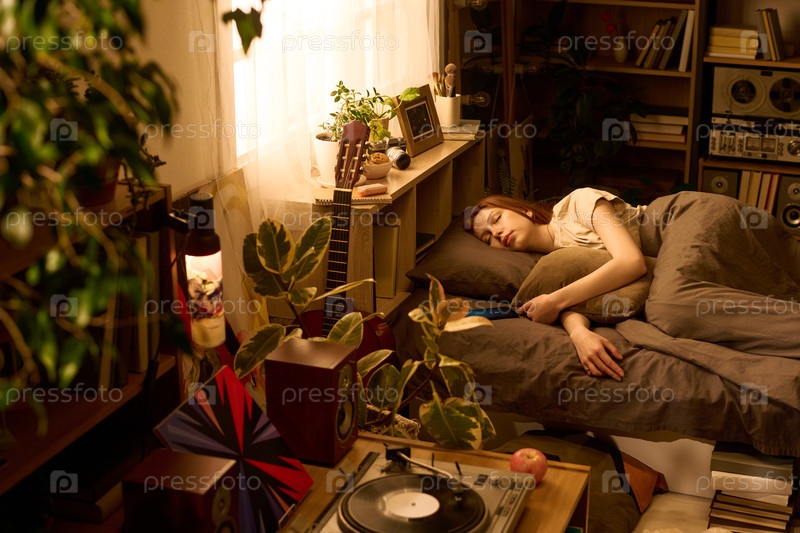 Молодая женщина спит спокойно в уютной спальне, окруженной растениями