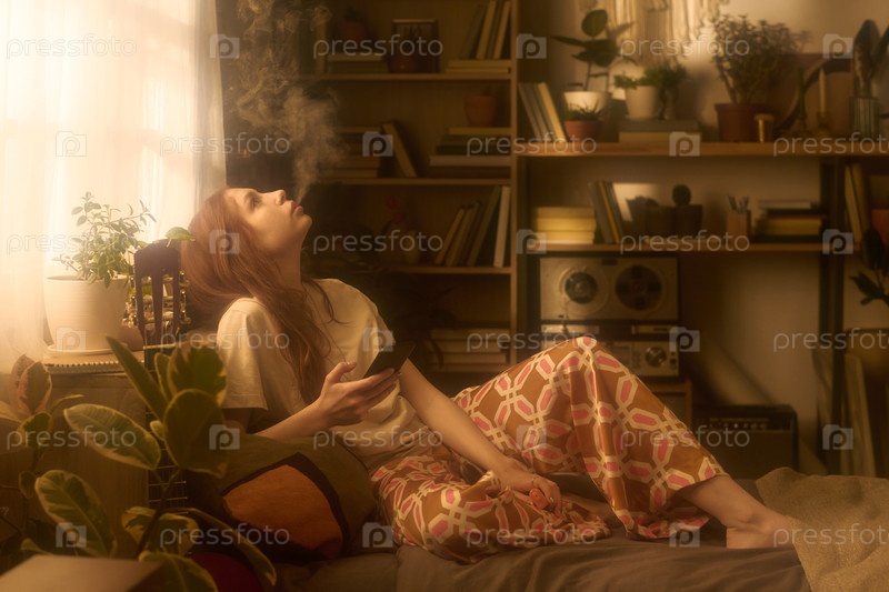 Молодая женщина отдыхает в помещении, держа смартфон и куря