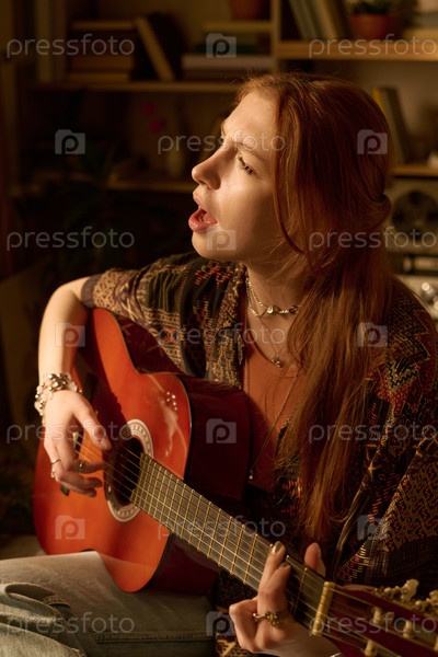 Молодая женщина поет, играя на акустической гитаре в помещении
