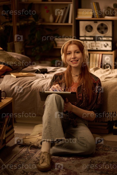 Портрет молодой женщины, слушающей музыку во время рисования на планшете