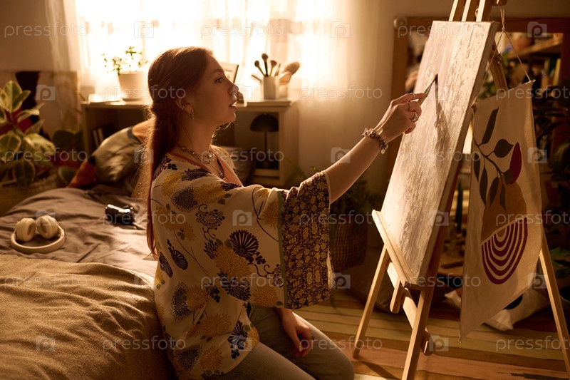 Молодая женщина рисует на холсте в солнечной домашней художественной студии