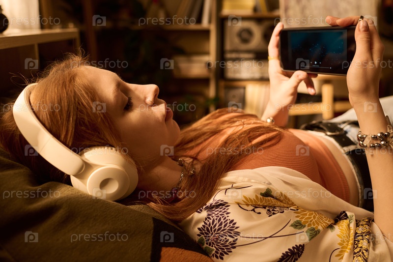 Девушка-подросток отдыхает на диване, слушает музыку и смотрит видео