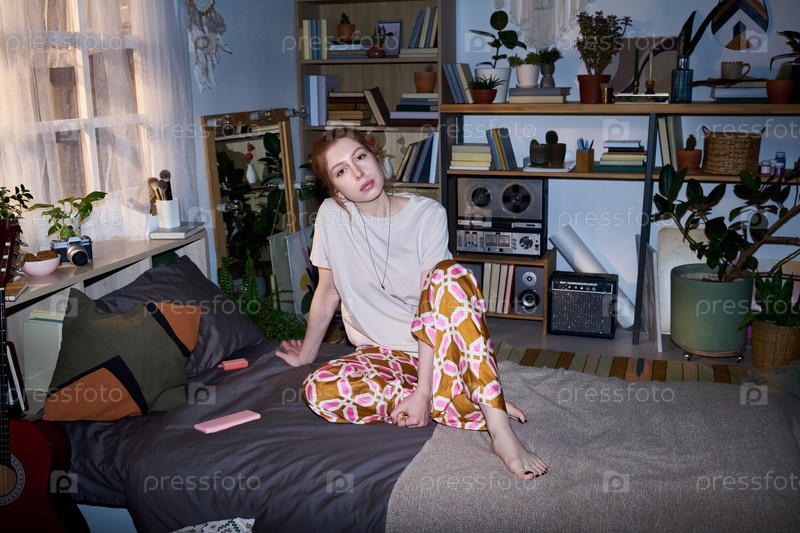 Портрет молодой взрослой женщины, сидящей на кровати и отдыхающей дома