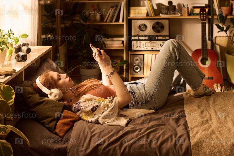 Девушка-подросток слушает музыку и просматривает смартфон в помещении