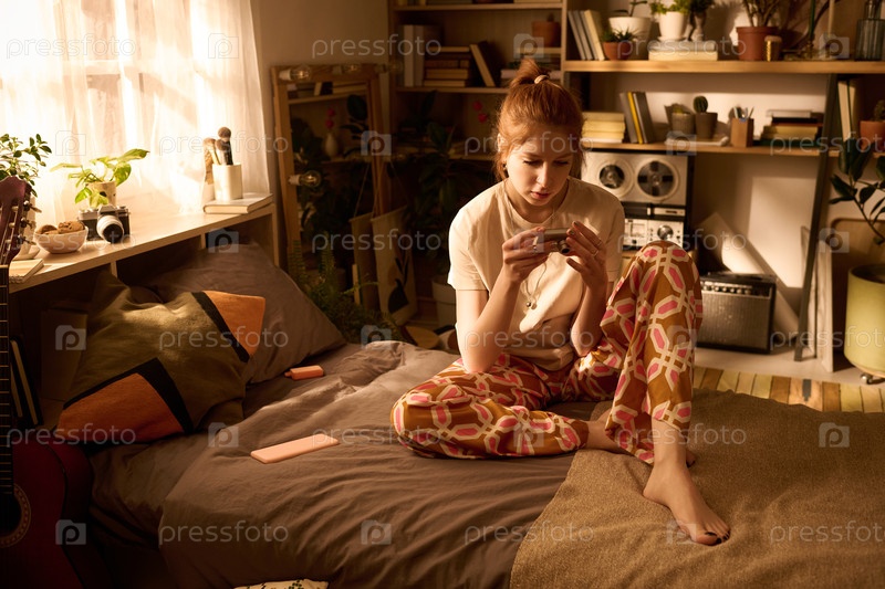 Молодая женщина сидит на кровати с помощью смартфона в уютной спальне
