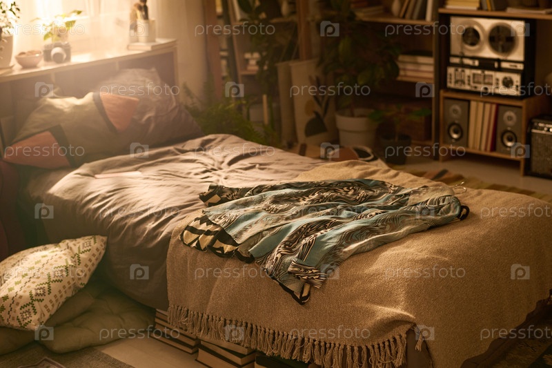 Пустой уютный интерьер спальни с потоком солнечного света на незаготовленную кровать