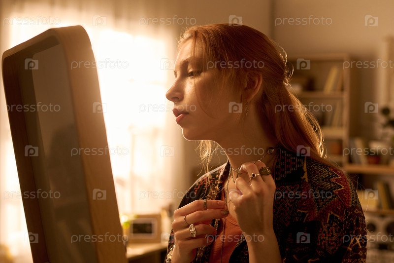 Молодая женщина корректирует ожерелье, глядя в зеркало внутри дома