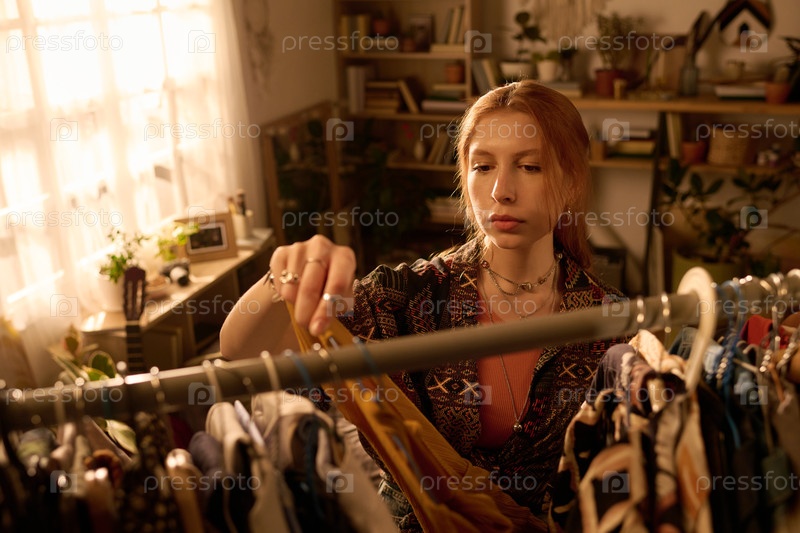 Молодая взрослая женщина выбирает одежду из стойки для одежды в помещении