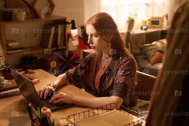 Молодая взрослая женщина работает на ноутбуке в уютной домашней конторе