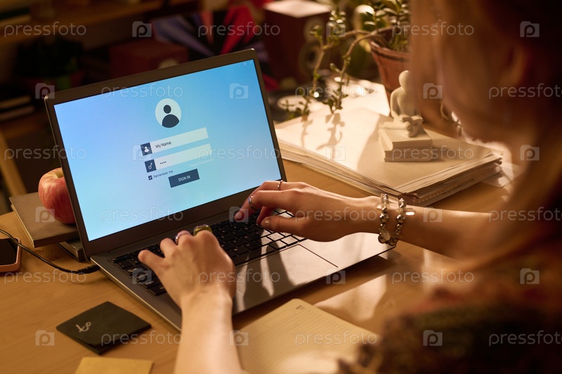 Молодая женщина, использующая ноутбук для входа в онлайн-аккаунт на рабочем столе