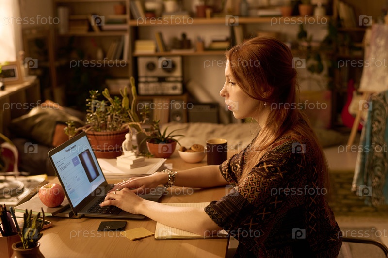 Молодая женщина работает удаленно на ноутбуке в уютной домашней конторе