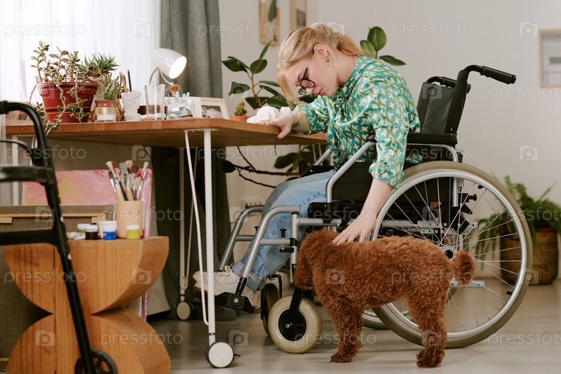 Молодая взрослая женщина с инвалидностью ласкает собаку, работая за рабочим столом