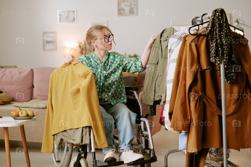 Молодая взрослая женщина с инвалидностью выбирает одежду на стойке в помещении