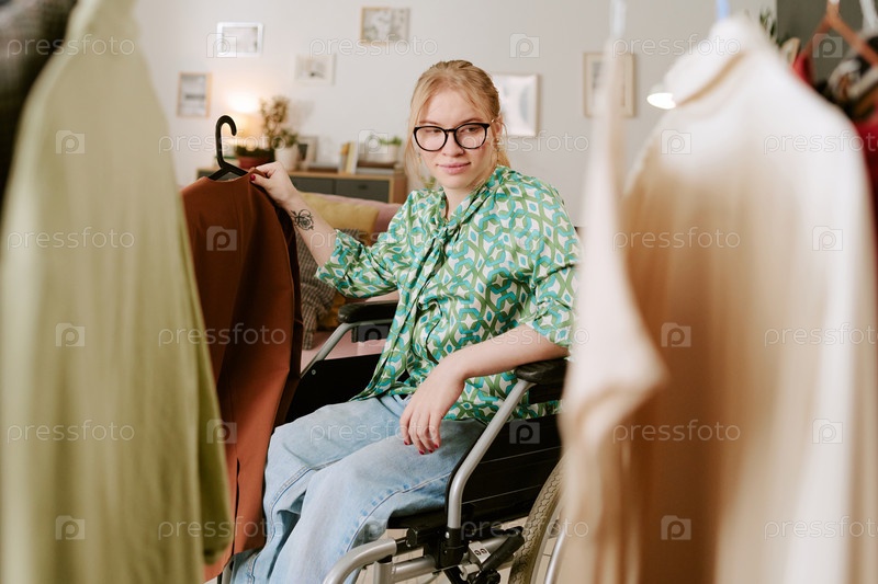 Молодая женщина-взрослый с инвалидностью, выбирающая одежду в инвалидном кресле