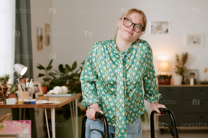 Молодая женщина, использующая устройство Walker Device, стоит в Bright Home Studio