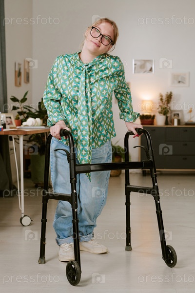 Портрет молодой женщины, использующей ходунка и улыбающуюся в помещении