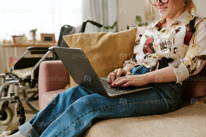 Молодая взрослая женщина печатает на ноутбуке, отдыхая с инвалидностью
