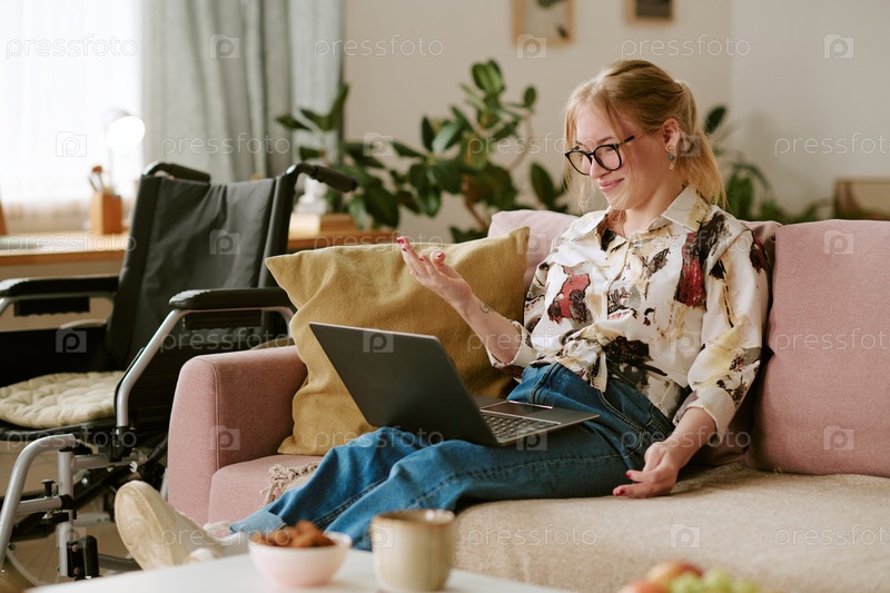 Молодая женщина с инвалидностью использует ноутбук во время видеочата дома