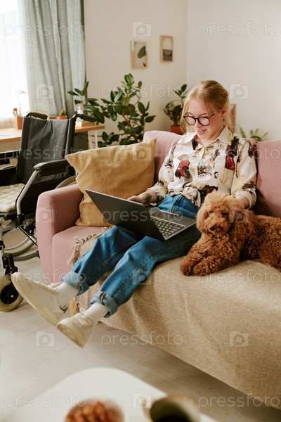 Молодая женщина сидит с инвалидностью, используя стоп и собаку для прикосновений