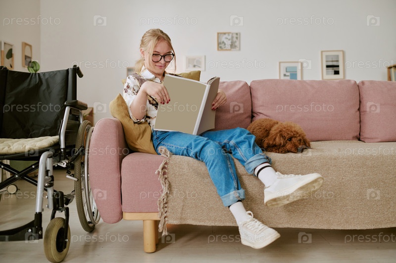 Женщина, читающая книгу рядом с инвалидной коляской и отдыхающей собакой в помещении