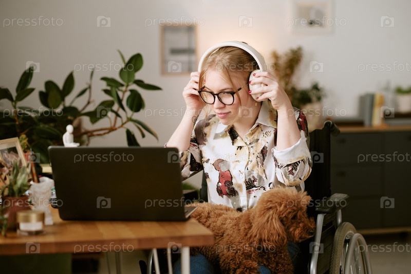 Молодая женщина с инвалидностью использует ноутбук и слушает музыку