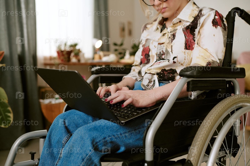 Молодая взрослая женщина с инвалидностью использует ноутбук во время работы в помещении