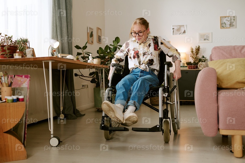 Молодая взрослая женщина с инвалидностью перемещает коляску в помещении