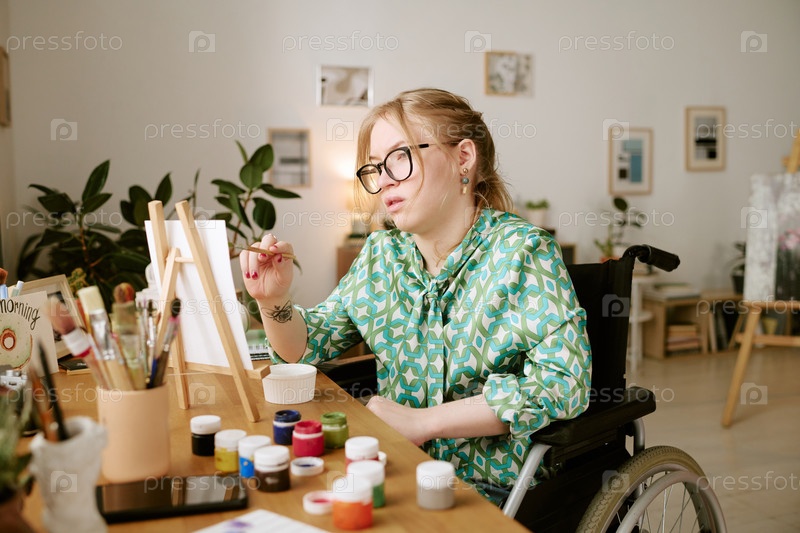 Молодая взрослая женщина с инвалидностью рисует на холсте в помещении