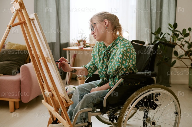 Молодая женщина-взрослый с инвалидностью создает произведения искусства в инвалидном кресле