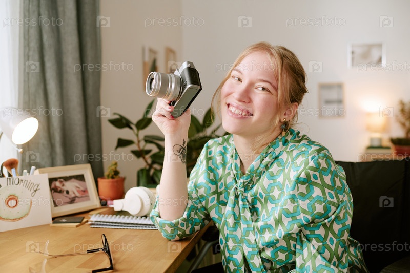 Портрет молодой женщины, улыбающейся, держа цифровую камеру в помещении