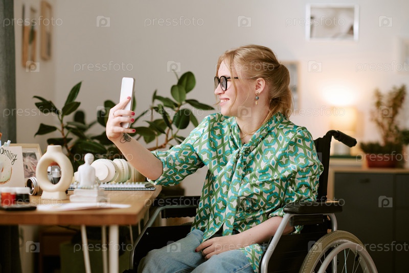 Молодая женщина с инвалидностью улыбается, делая селфи в помещении