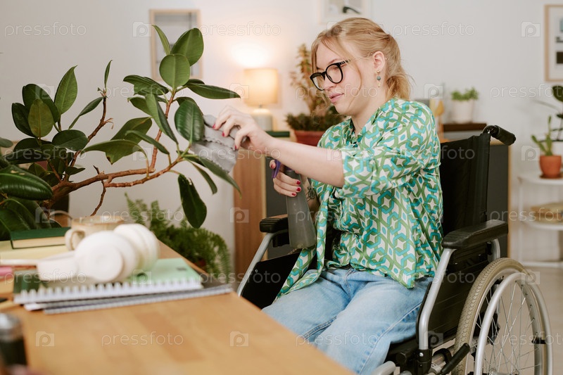 Молодая женщина с инвалидностью, убирающая растение листьев в домашнем офисе
