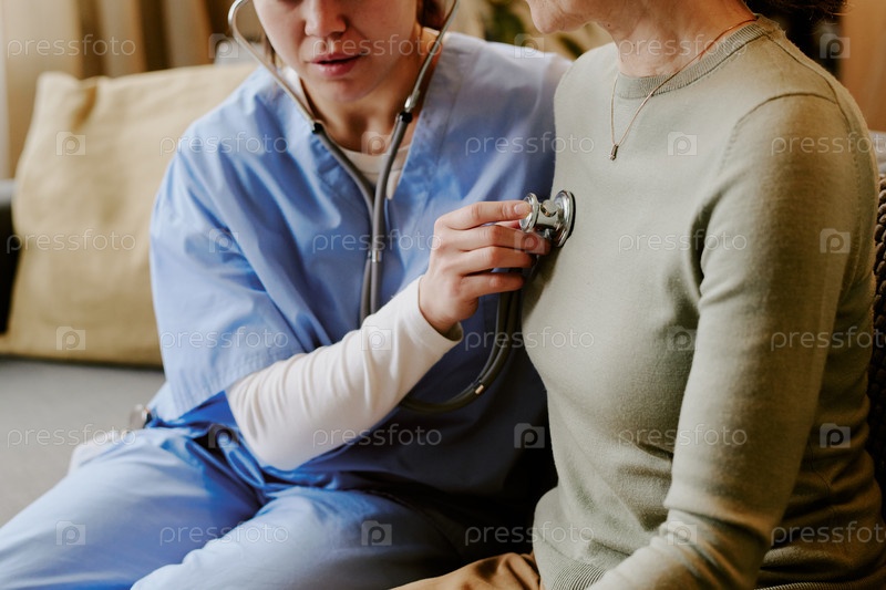 Молодая взрослая медсестра осматривает грудь женщины среднего возраста
