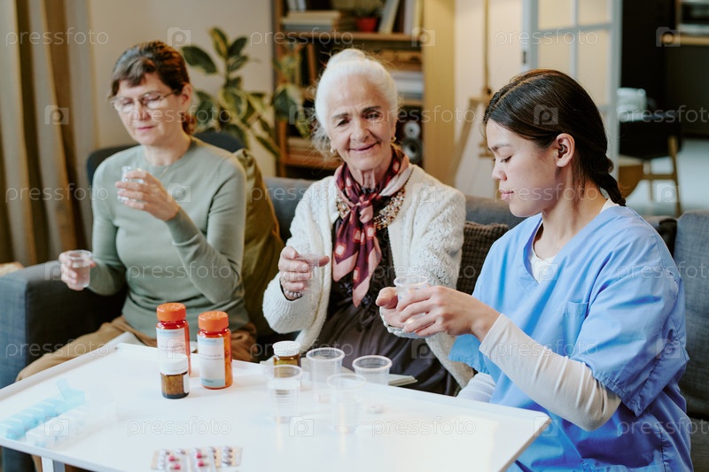 Женщина среднего возраста и пожилая женщина вместе принимают лекарства