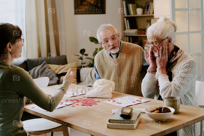 Женщина реагирует, играя в настольную игру со старшей парой