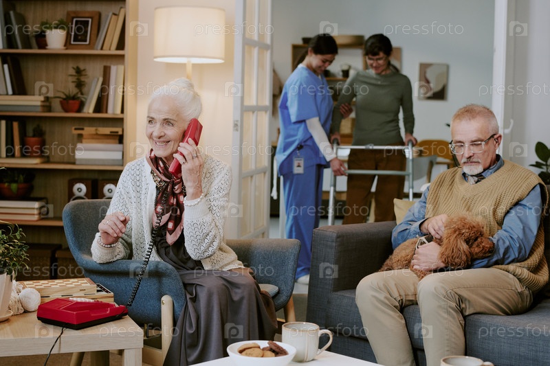 Старшая женщина разговаривает по телефону, в то время как старший мужчина ласкает собаку внутри