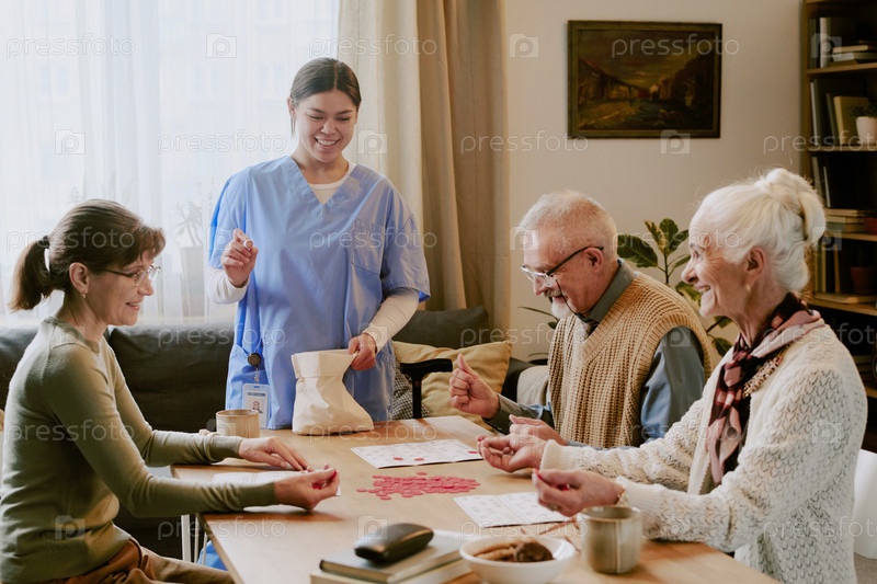 Группа пожилых людей, играющих в бинго с молодой латиноамериканской женщиной-попечителем