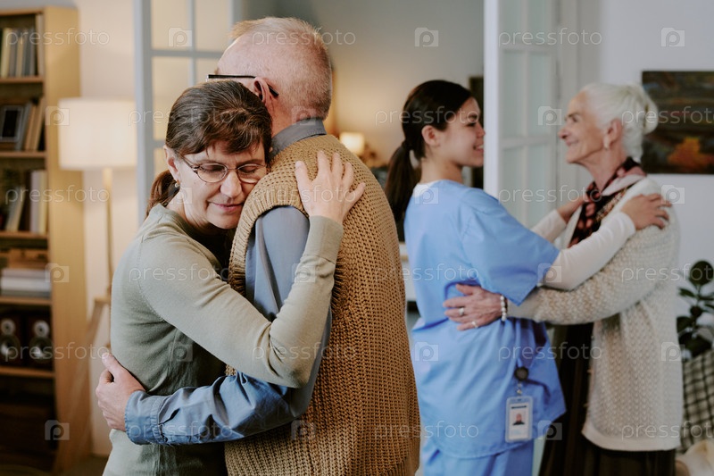 Старшая пара обнимается, пока медсестра помогает пожилой женщине