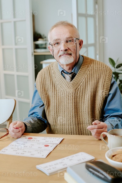 Портрет старшего человека, сидящего за столом и рассматривающего расписание календаря