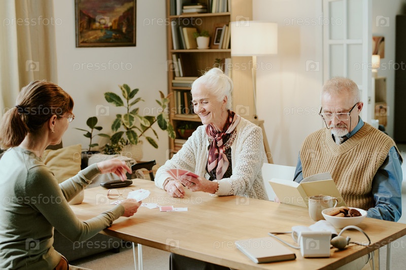 Старшая женщина и мужчина играют в карты с молодой взрослой женщиной