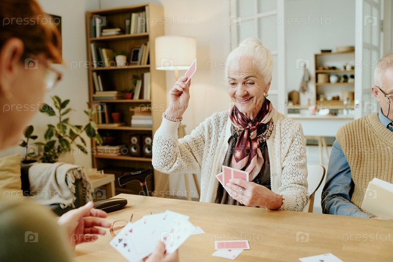 Старшая женщина улыбается, играя в карты с друзьями внутри дома