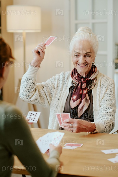 Женщина улыбается, играя в карты с молодой взрослой женщиной