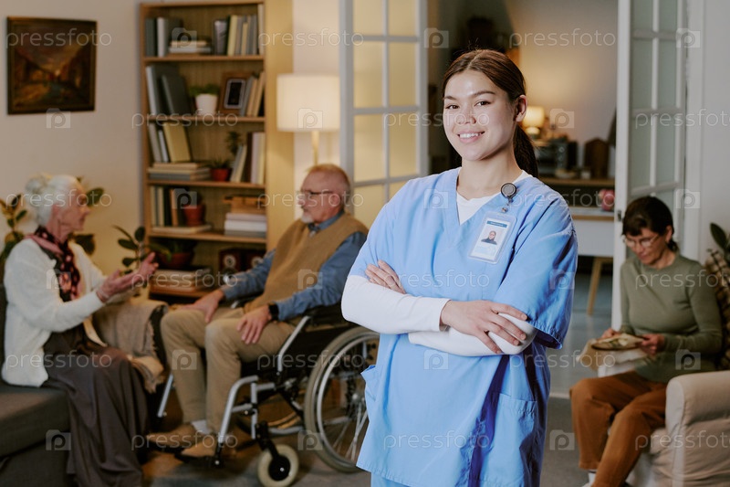 Молодая взрослая испаноязычная женщина медсестра улыбается, стоя в учреждении по уходу за престарелыми