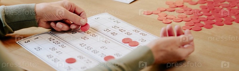 Старшая женщина играет в бинго и ставит фишки на карту